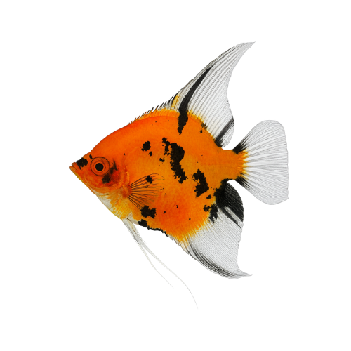 Note: The Angelfish is a popular and iconic aquarium species known for its graceful, triangular shape and flowing fins. They thrive in a well-planted tank with open swimming areas and some vertical structures like driftwood. Provide stable water parameters and a varied diet for optimal health. They are social fish that do best in small groups, but avoid overcrowding to minimize territorial disputes.